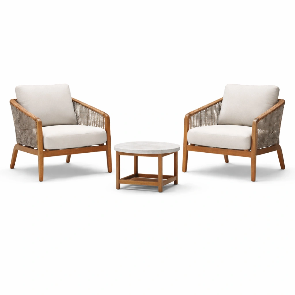 Conjunto de jardín de madera y cuerda con cojines y mesa redonda de concreto