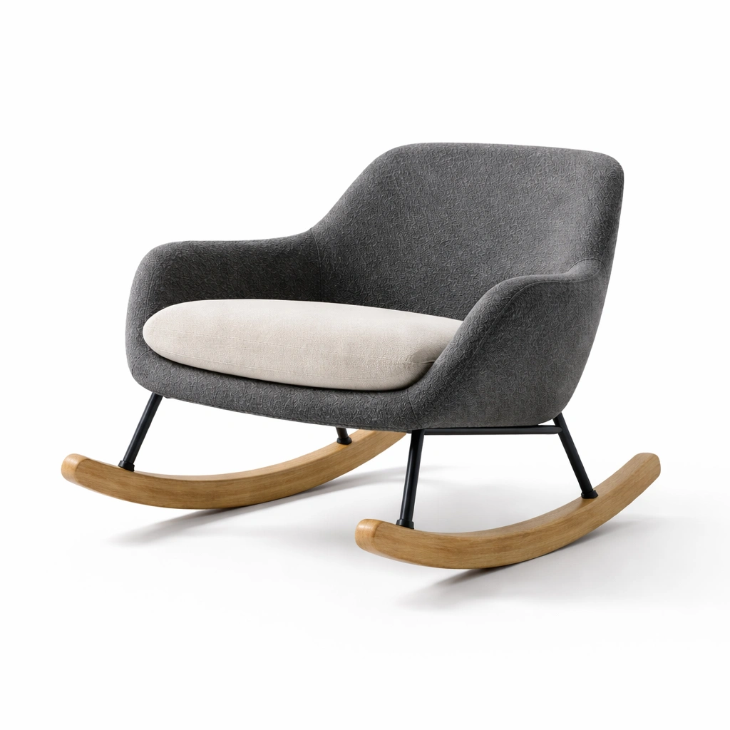 Silla mecedora de tela de poliéster gris oscuro con patas de madera de haya y asiento beige