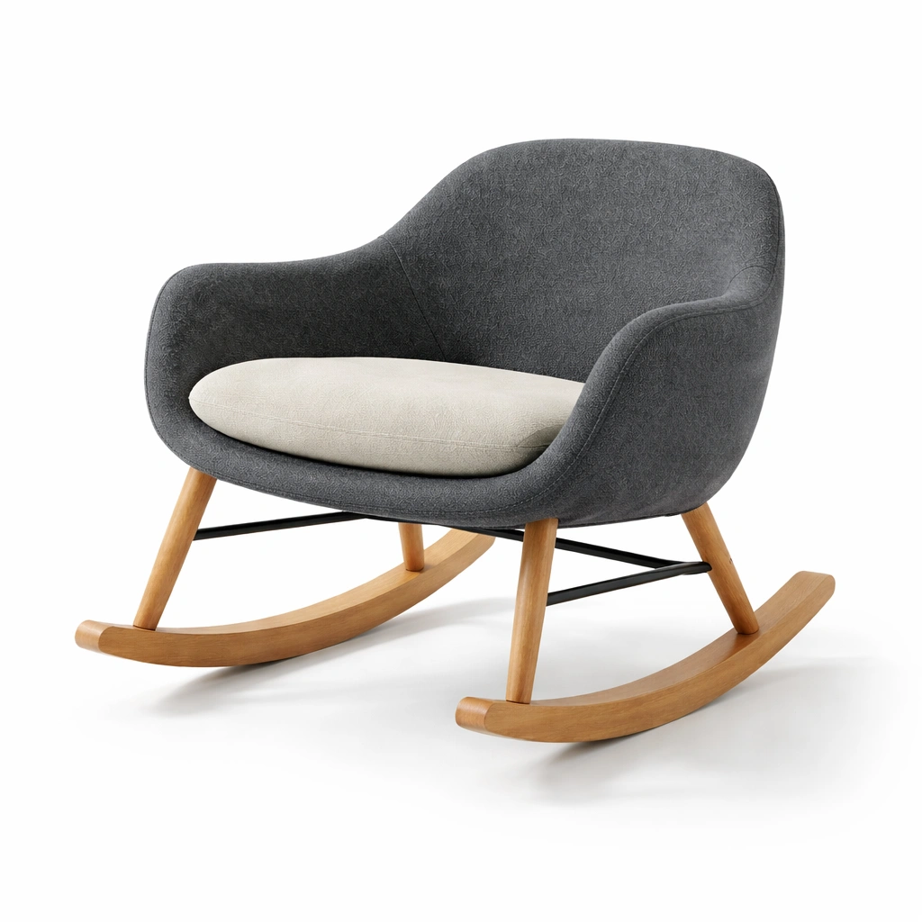 Silla mecedora de tela gris y madera de haya con cojín beige