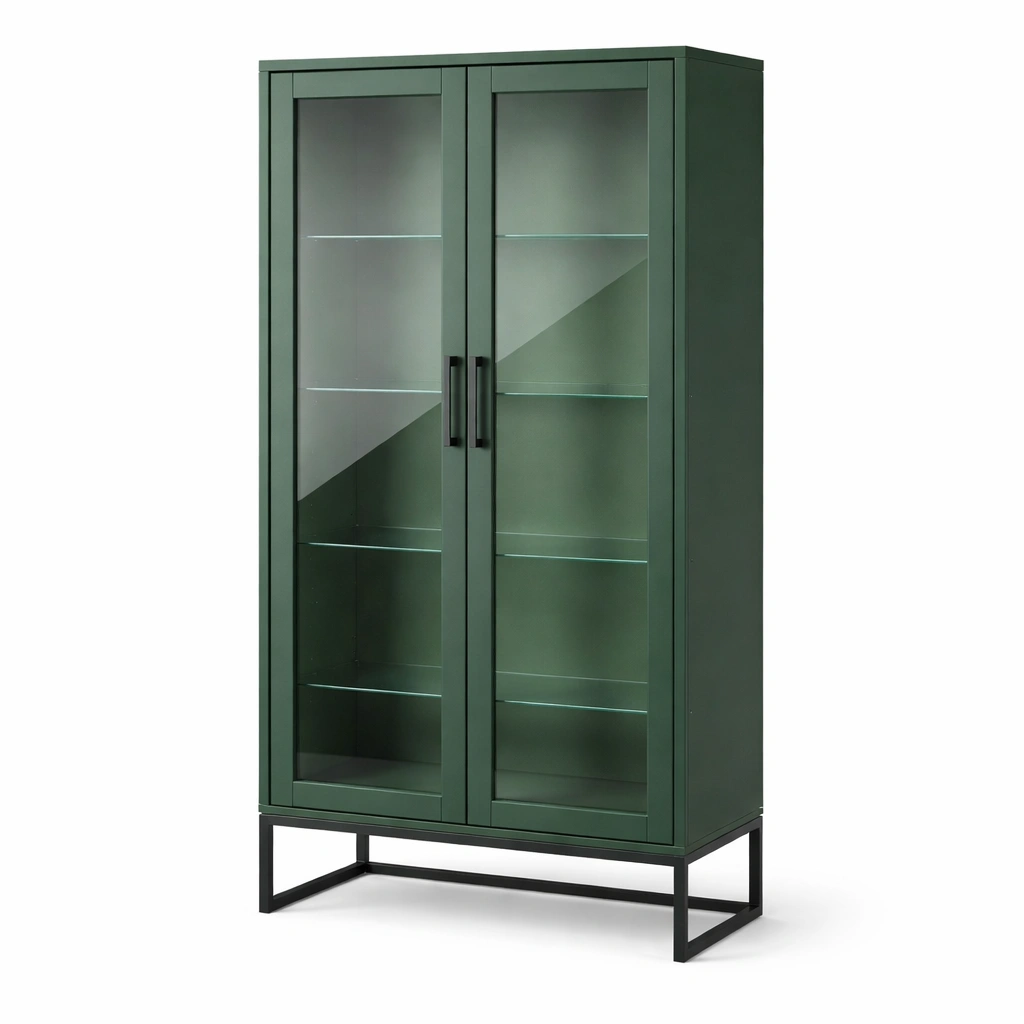 Vitrina de madera con puertas de vidrio y base metálica verde 180x90x40 cm