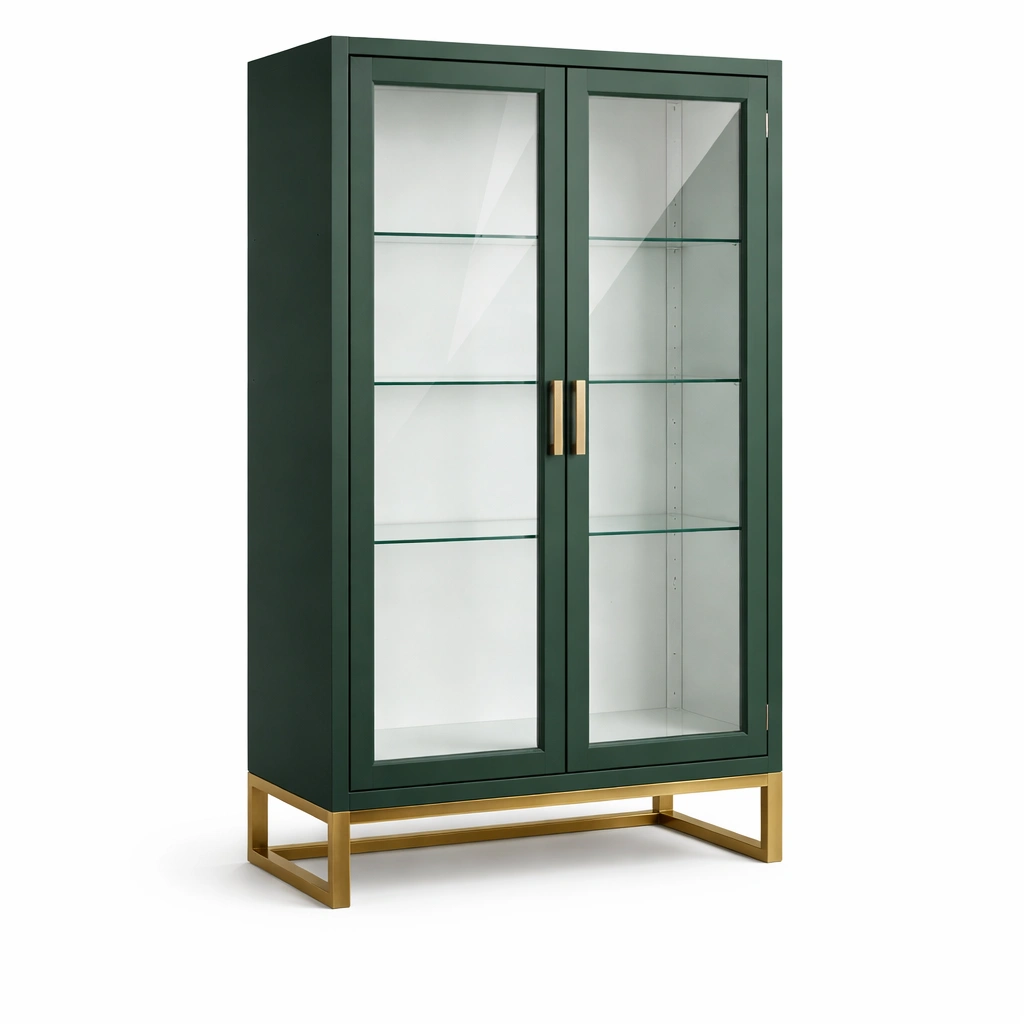Material: Estructura de madera, puertas de vidrio templado de 5 mm, base de metal.